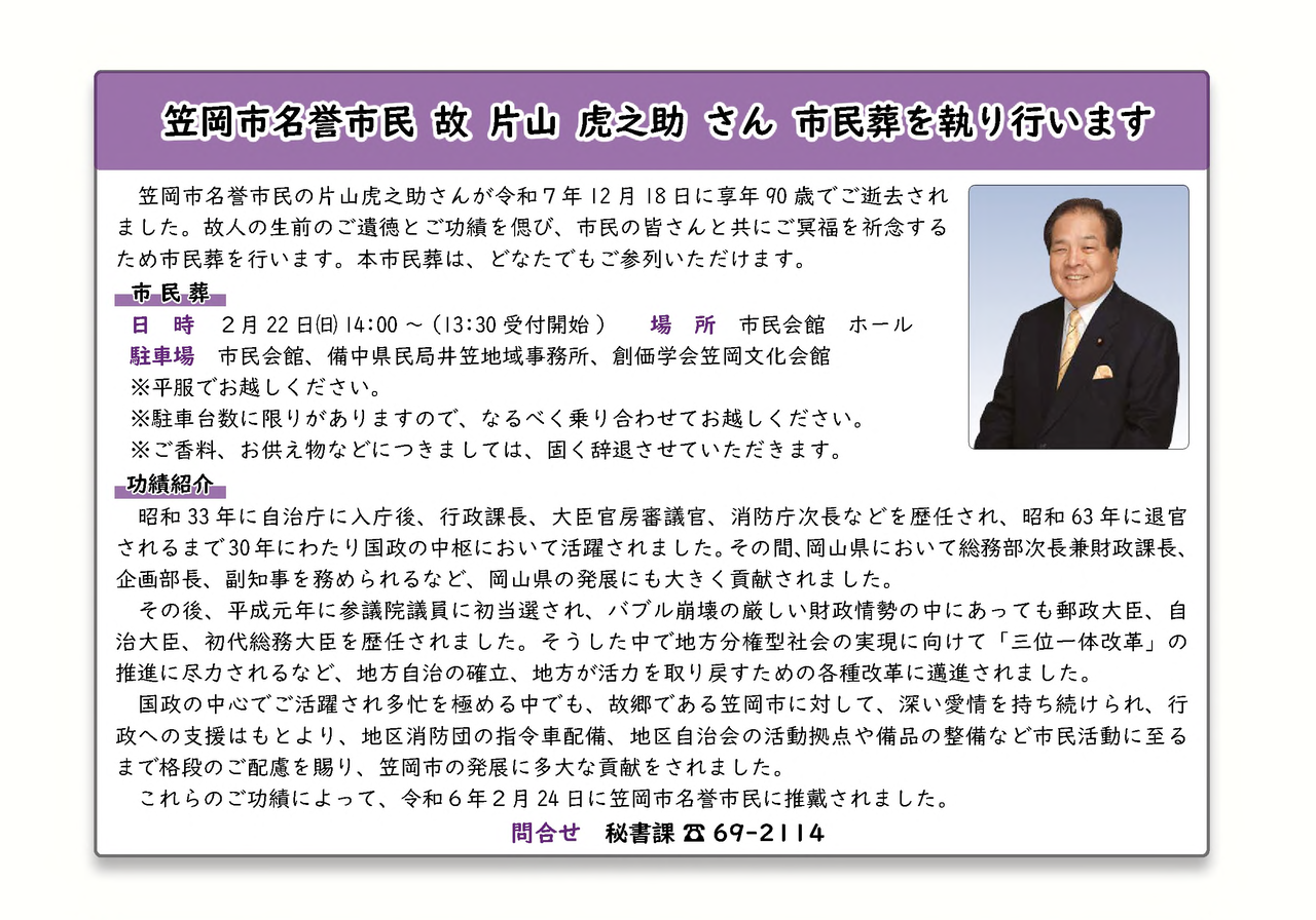 私が秘書としてお仕えした元総務大臣、参議院議員片山虎之助先生の、笠岡市市民葬が下記の日程で執り行われます。(片山先生は笠岡市の名誉市民でした)