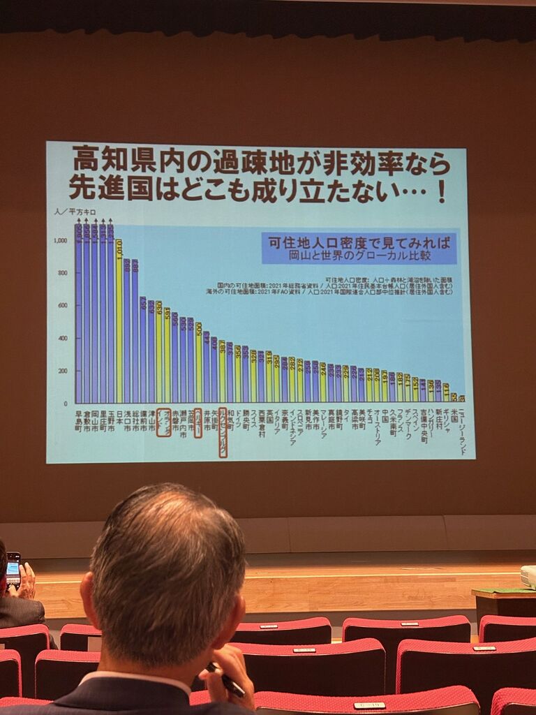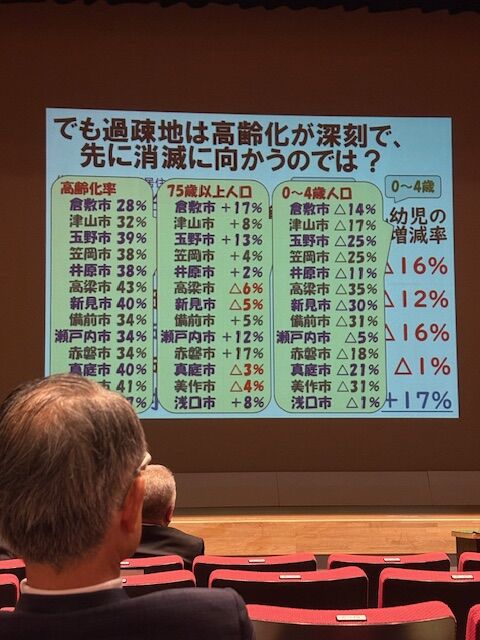 (講演でのスライドから。2025年vs2050年の岡山県自治体比較。すみません、勝手に使用させて頂いています。)