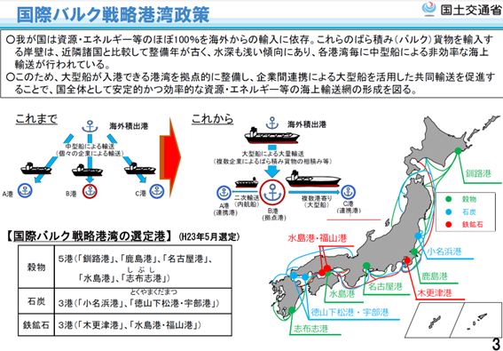 外洋から多数の中型船で輸送し、浅い港で個別に荷受けするより、大型船が入港可能な深い港を全国に何ヶ所か整備する政策を進めています(より小さい港にはそこから積み替えて運ぶなどします)。