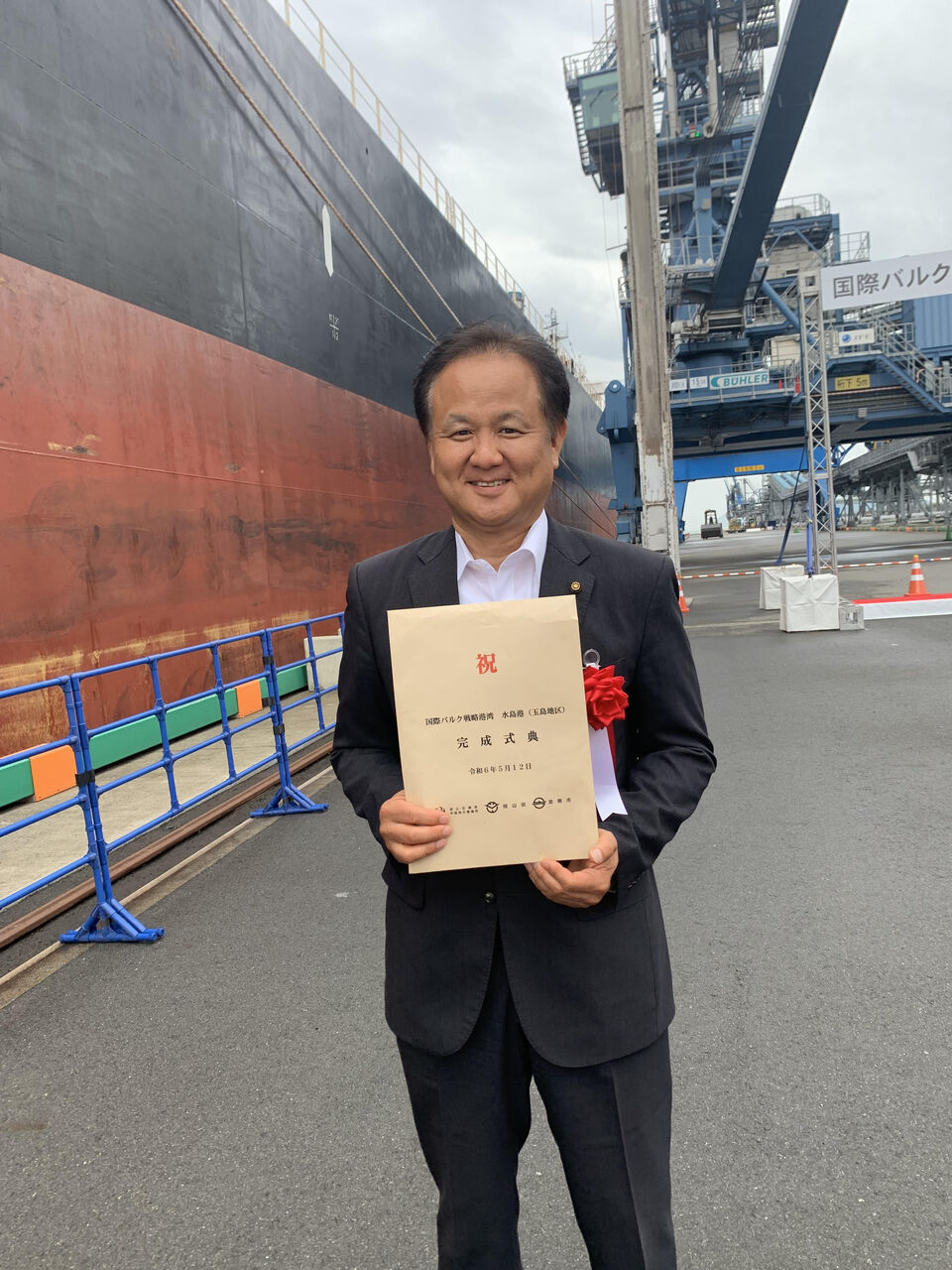 国際バルク戦略港湾 水島港(玉島地区)完成式に出席しました。 金属原料、エネルギー、穀物など主要な資源は全て輸入に頼る我が国にとって、大型船が入港できる(=輸送効率のいい)玄関口を備えることが重要であることは言うまでもありません。