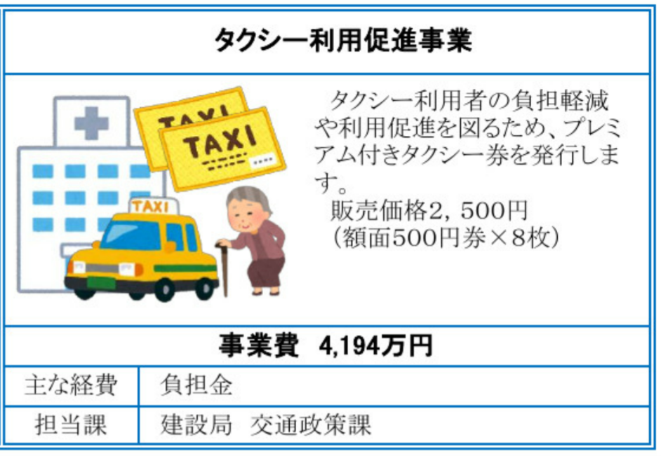 新型コロナの影響で利用者が減少しているタクシー事業者を支援するための 割引付タクシー券です。