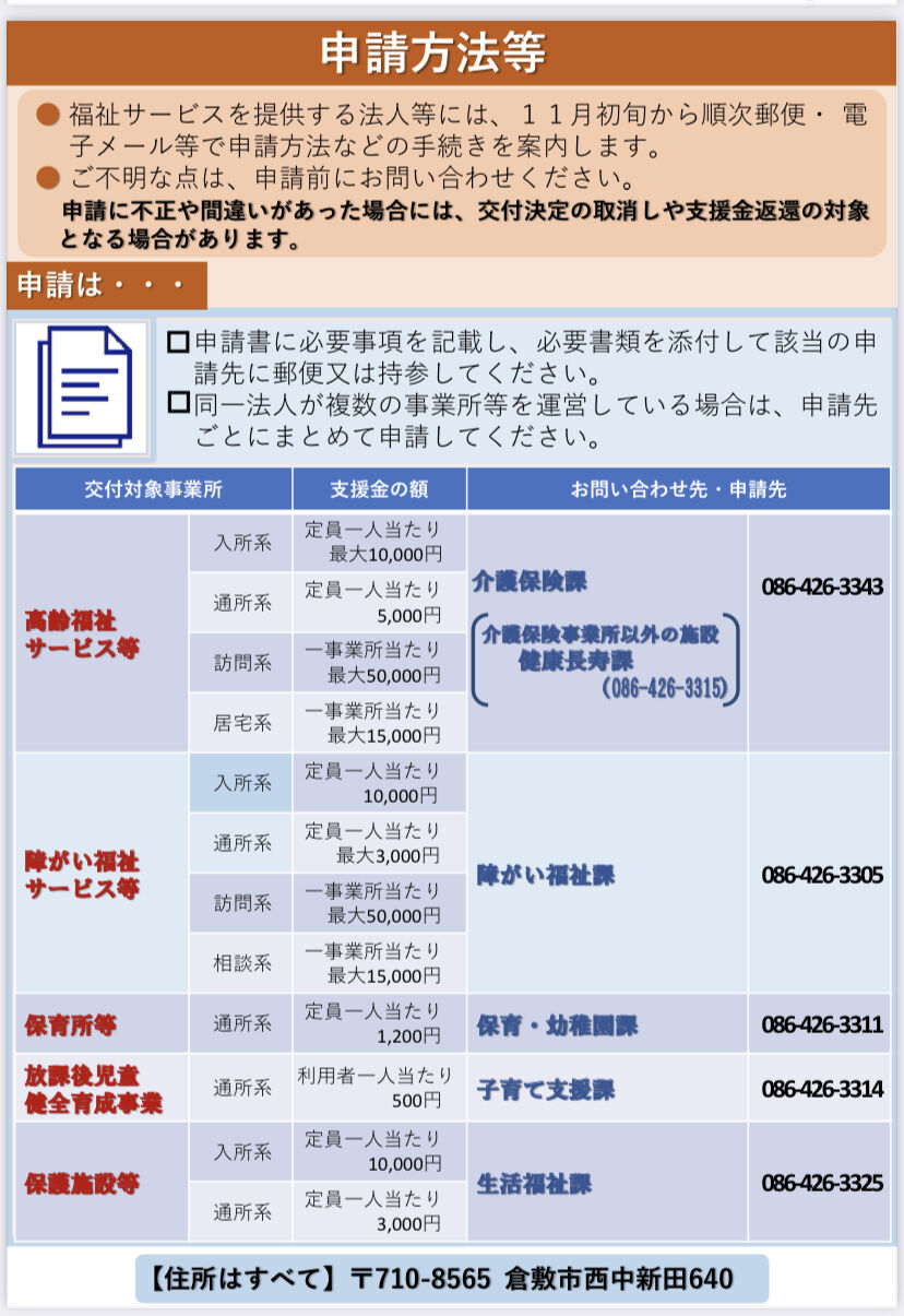 対象は、各種の高齢者、障害者福祉サービス事業所、保育所、放課後児童クラブ、保護施設等など幅広く設定されています。支援額は、一事業所当たりの総額、あるいは、定員/利用者一人あたり単価で計算され、1事業所当たり40万円が上限です。詳細は下のリーフレットの通り。