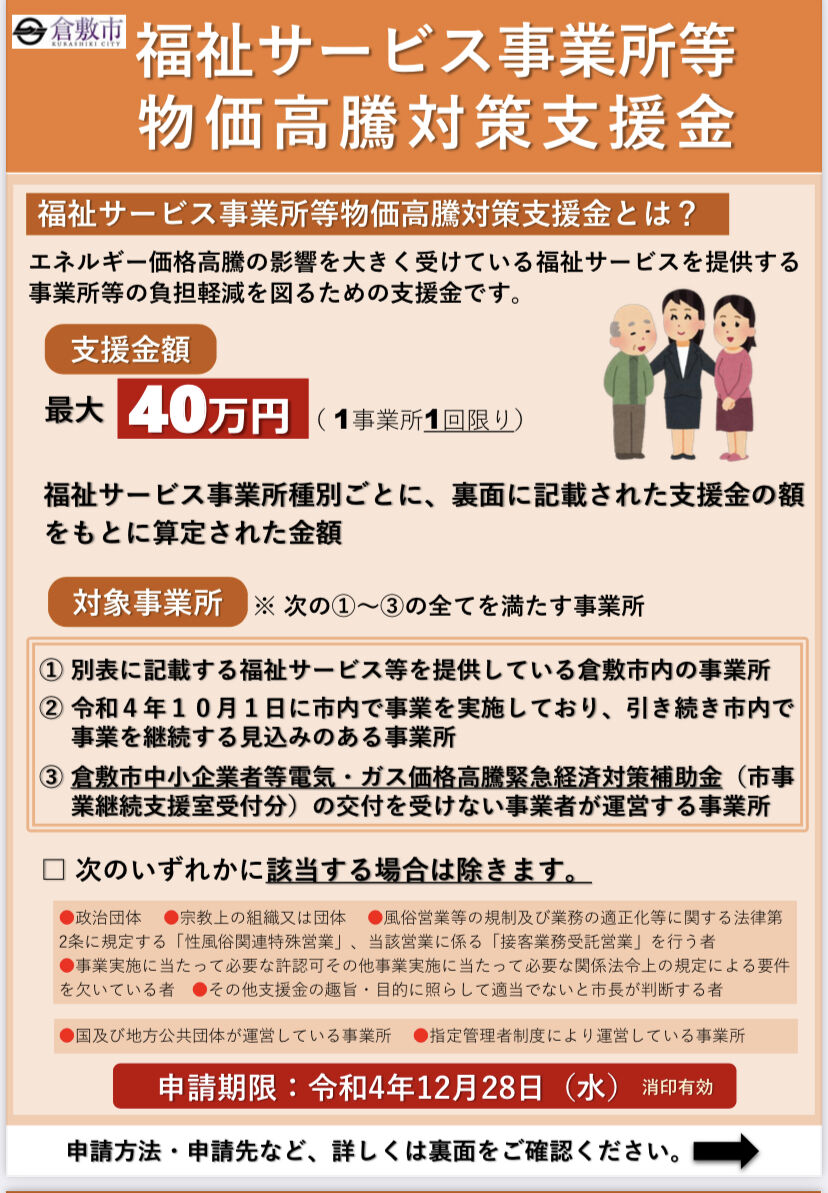 福祉事業所向け物価高騰対策支援金の交付を発表されています。