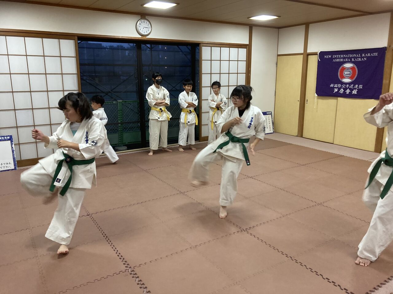 型稽古では空手女子のめいちゃん先生、その弟子りょう、かいとの3人で道場生を厳しく見守り中。