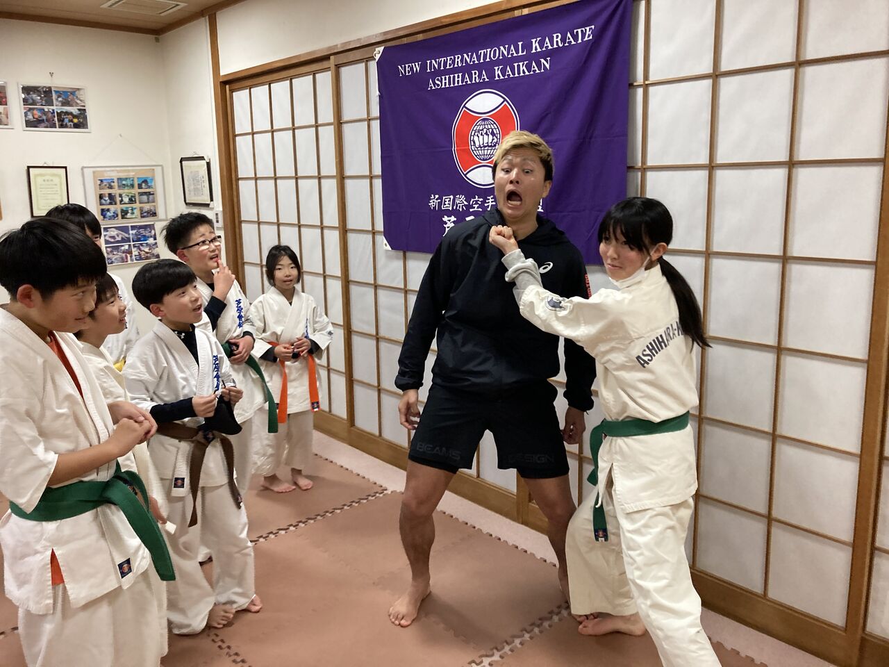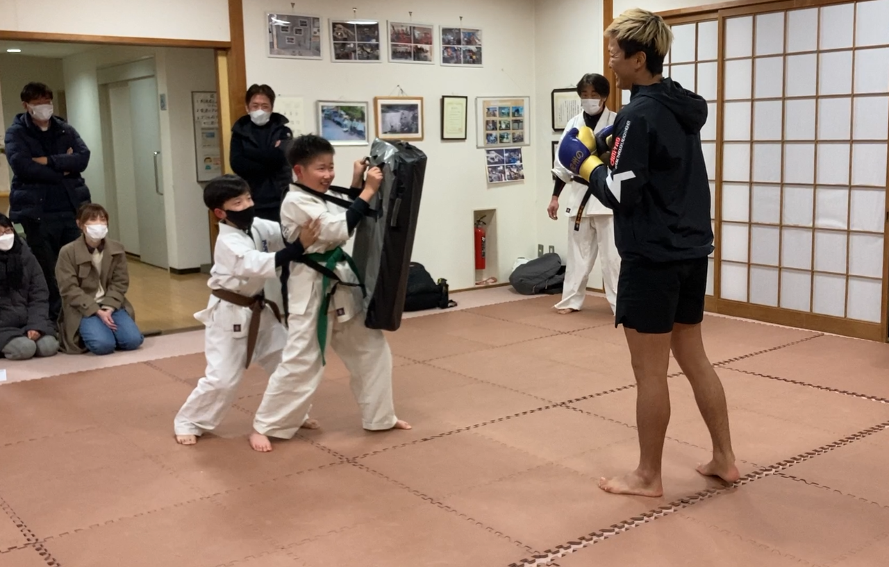 続いて少年部黒帯のたいががその強烈な蹴りの打撃を体験。