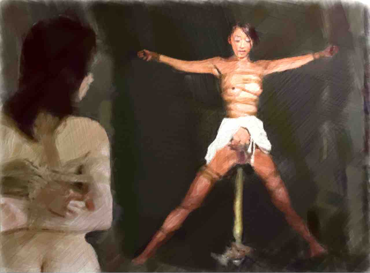 お香の両脚は真っ直ぐに伸び、足首にはかなりの重量の鉄の塊が結び付けてあった。その素肌からは過酷な責めのためだろうビッショリと汗が浮き、唇からは赤い物が垂れていた。そして、低い呻き声をあげ、顔を反らし、まさに息も絶え絶えの有り様であった。