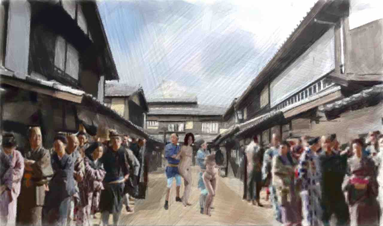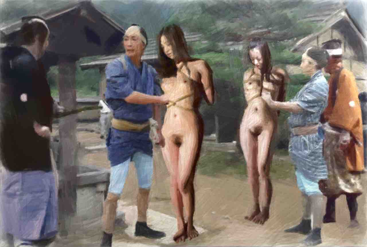 二人の女は一糸纏わぬ素っ裸にされ、両手を後ろに回され厳しく縛られていた。豊かな乳房にもキリリと縄が掛けられ、二人の乳房は痛いほど突き出されている。この惨めで恥ずかしい姿でお小夜とお多喜は街中の目抜き通りを素足で歩いて引き回されて行くのである。、