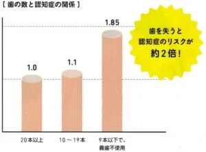 また、厚労省研究班は65歳以上の高齢者4425人を4年間にわたって追跡調査した結果、歯を失って噛めなくなった人は、認知症のリスクが約2倍も高くなることや、残っている歯が少ないほど記憶や運動などの能力が低下する傾向にあることも報告しています。つまり、噛む力を維持すれば、認知症予防や運動機能低下も防げることになるということです。