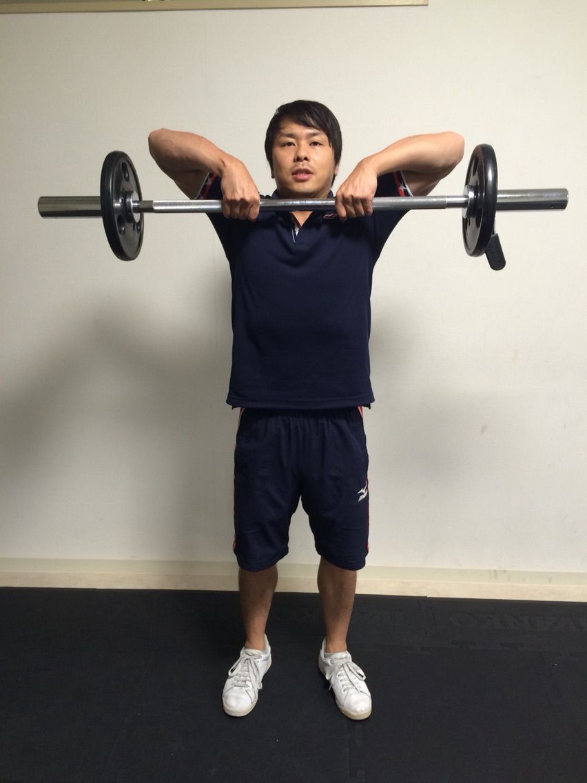姿勢を正し、肩よりも肘が高くなるまでゆっくり上げ