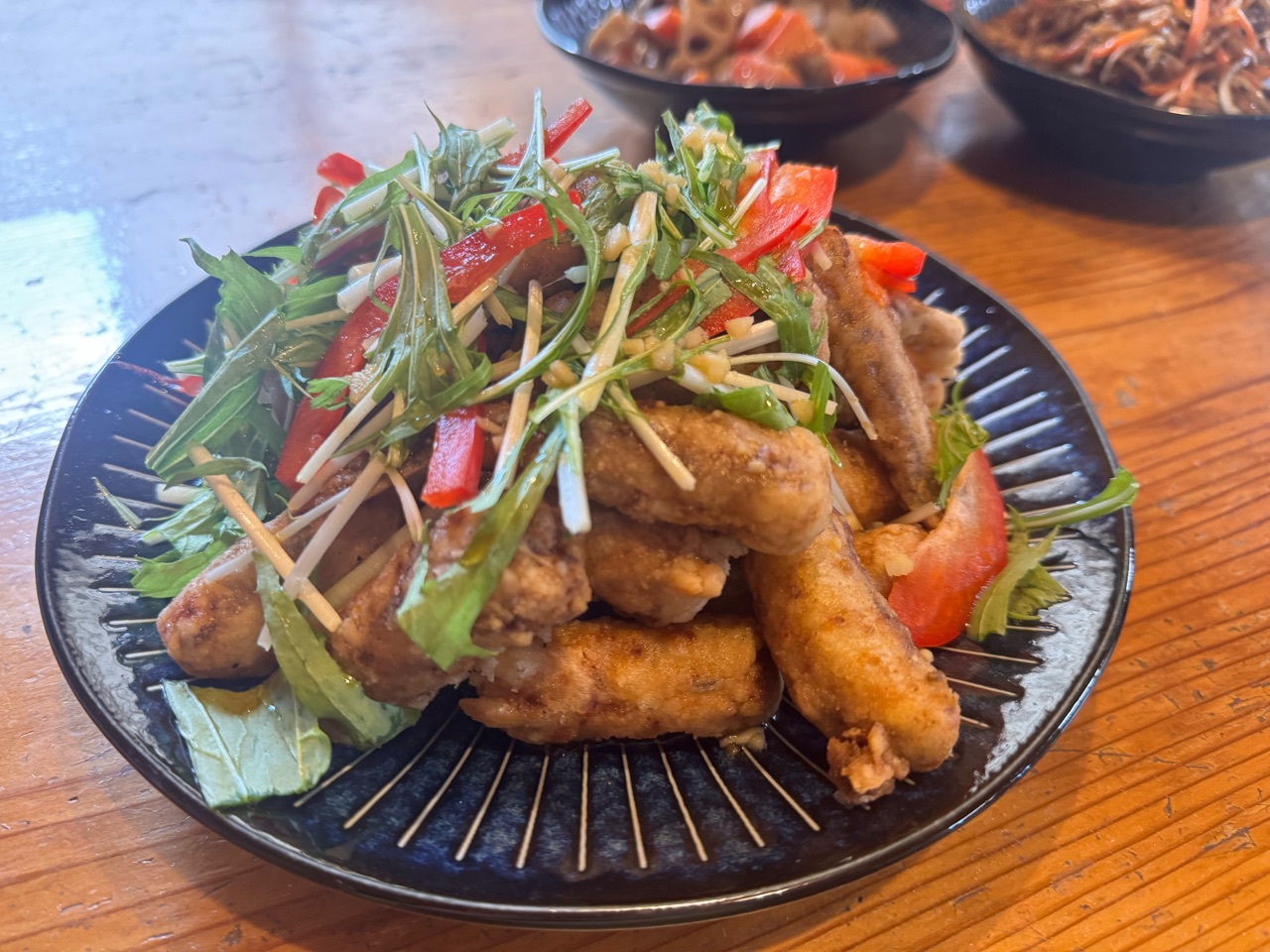 - 揚がったメギスを盛り付け そこにお好みで水菜・パプリカを盛り付けて、③のソースを上からかければ完成!