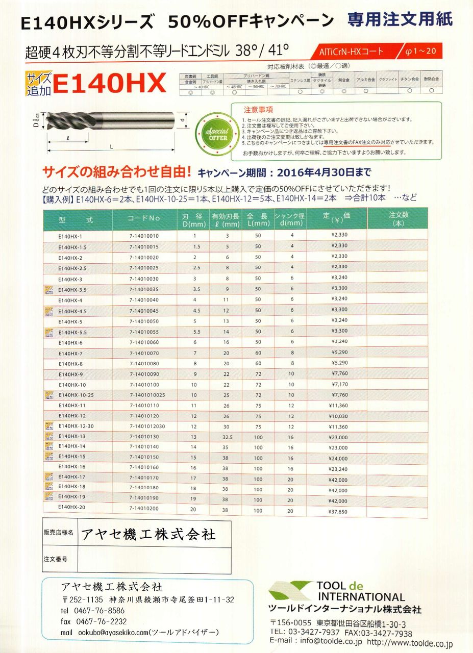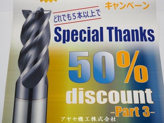 不等分割不等リード4枚刃エンドミル「E140HX」シリーズのサイズ拡充記念50%OFFキャンペーン。「工具コストを抑えたい」そんなお客様にお勧めのキャンペーン。
