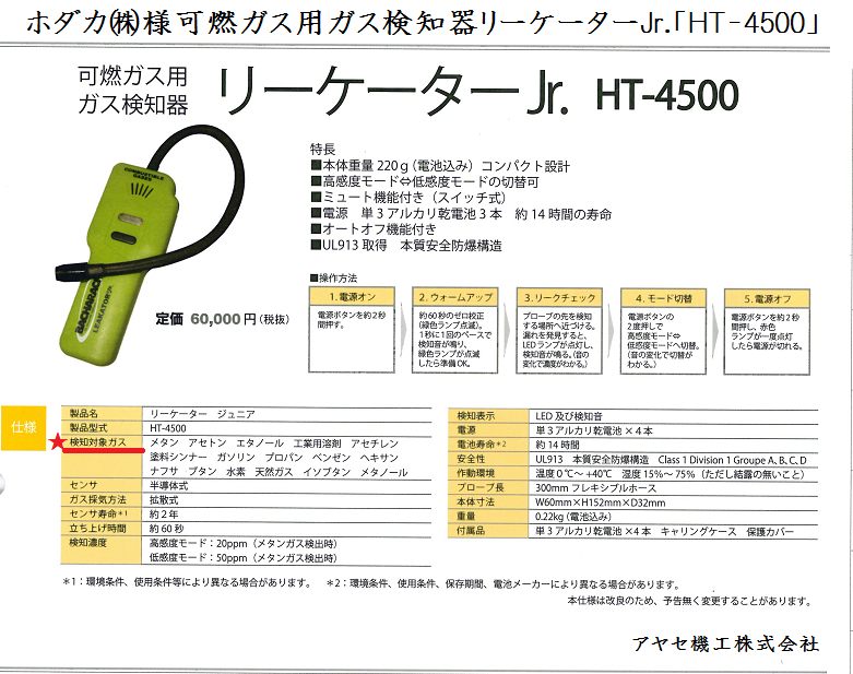 本日は、ホダカ㈱様の可燃ガス用ガス検知器「リーケーターJr. HT-4500型」のご案内です。