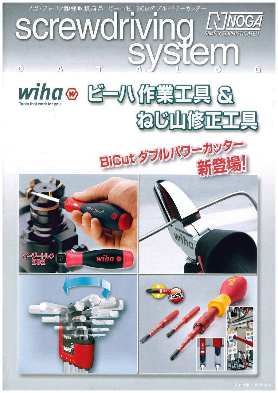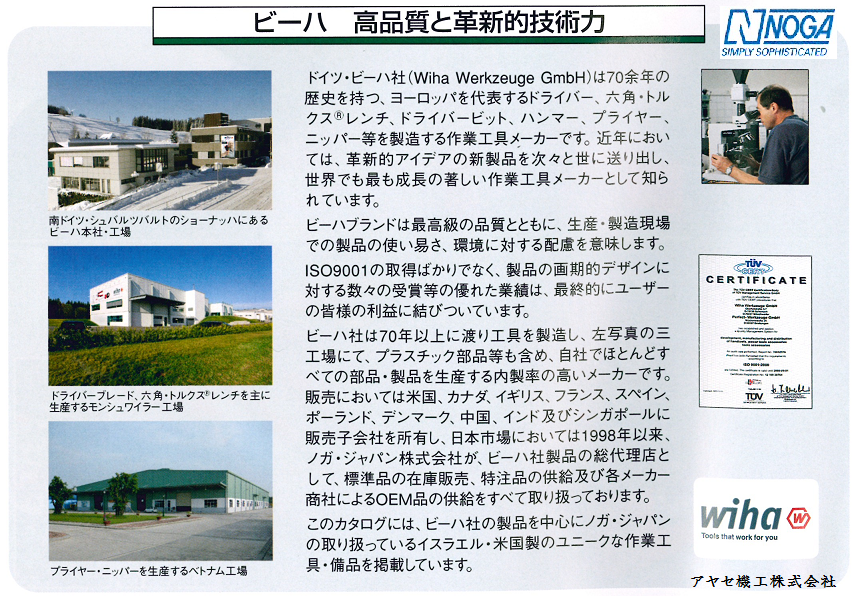 ドイツ・ビーハ社(Wiha Werkzeuge GmbH)様は、70年以上の歴史を持つドライバー、六角・トルククス(R)レンチ、ドライバービト、ハンマープライヤー、ニッパーなどを製造されている作業工のメーカー様で、日本ではノガ・ジャパン㈱様が取扱いをされています。
