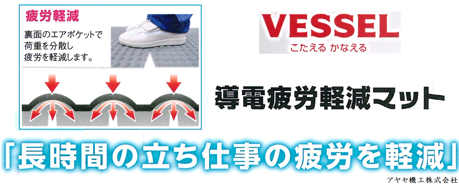 転倒防止や衛生対策などの配慮もされ、立ち仕事の疲労を軽減させてくれる㈱ベッセル様の導電疲労軽減マット。疲労軽減による作業効率の向上をお考えのお客様にはぜひお試しいただきたい商品です。