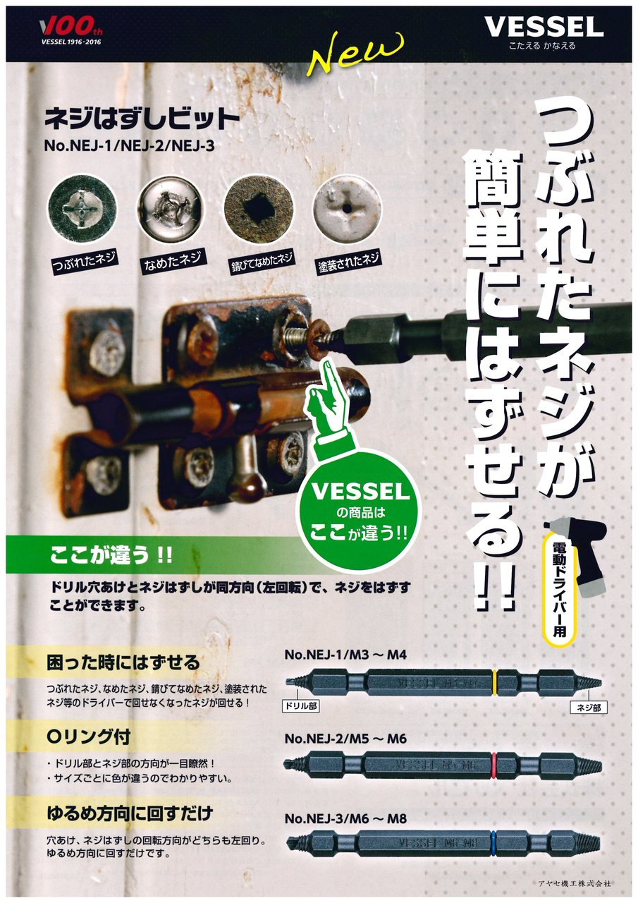 本日は、1916年の創業から100年のファシニングツールのリーティングカンパニー㈱ベッセル(VESSEL)様の新商品、ネジはずしビットのご案内です。