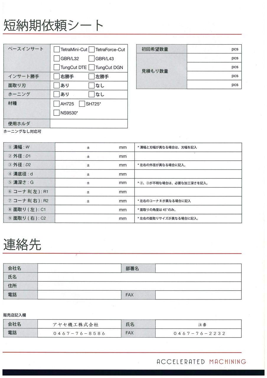ご利用の際は専用の短納期依頼シートにご希望の形状の数値をご記入頂き、アヤセ機工㈱へFAX若しくはメールでご依頼下さい。