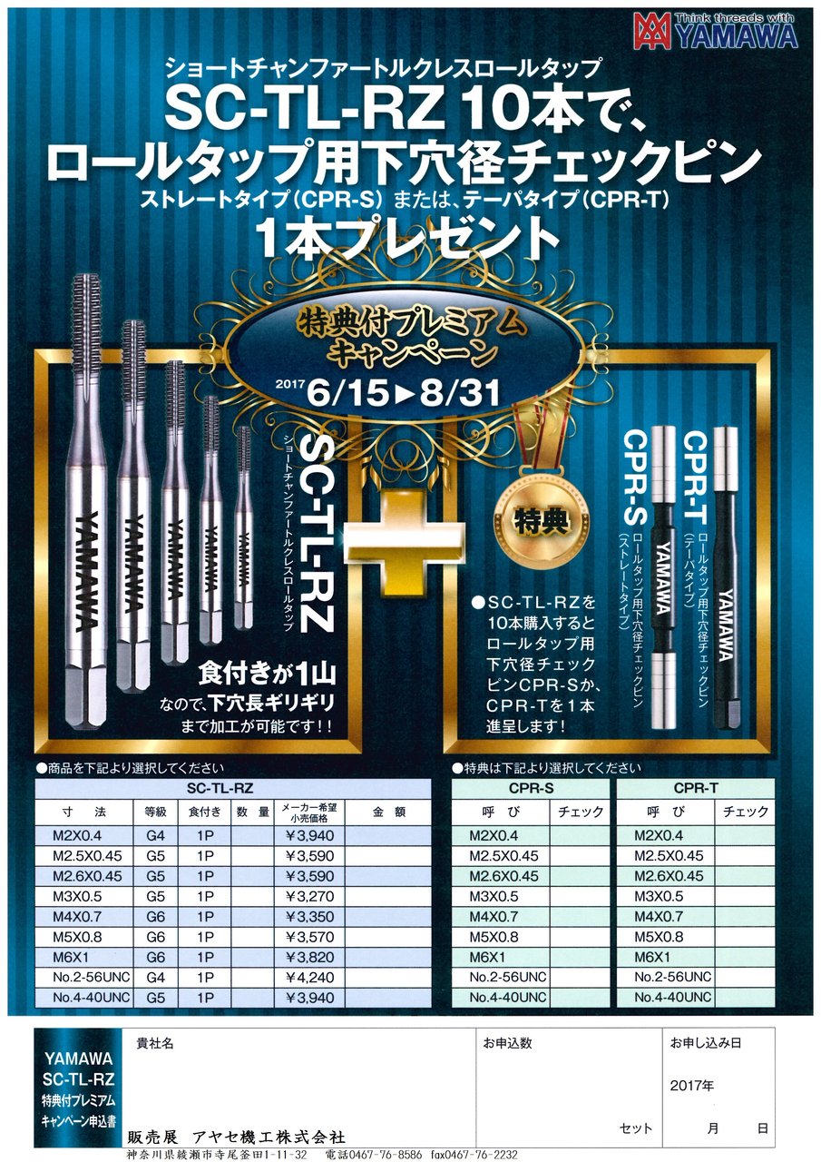 本日は、㈱彌満和製作所様のキャンペーン、ショートチャンファートルクレスロールタップ「SC-TL-RZ」特典プレミアムキャンペーンのご案内です。