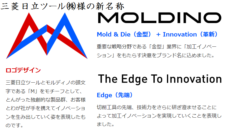 三菱マテリアル様との合併後の独自の新ブランドであるMOLINOはモルディノと読み、英語で金型を意味する「MOLD&DIE」と、革新を意味する「INNOVATION」から名付けられたそうです。