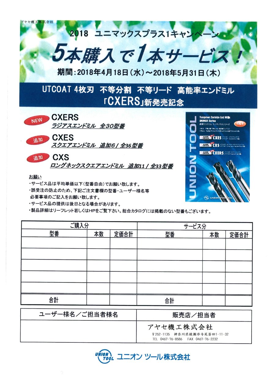 本日は、ユニオンツール㈱様の新商品と追加商品 超硬エンドミルユニマックスシリーズ 4枚刃 不等分割不等リード高能率エンドミル「CXES」「CXS」「CXERS」とキャンペーンのご案内です。