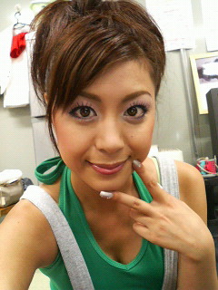 ピンクの衣装の写メは昨日の私で、グリーンの写メは今日の私(^-^)ステージ用メイクだから、超濃すぎて近くで見たら引くかも(^-^;