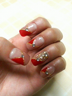 こんばんはo(^▽^)o昨日はネイルサロンに行ってきたよ☆今回は赤とベージュにゴールドのライン&ストーンを乗せました〜♪