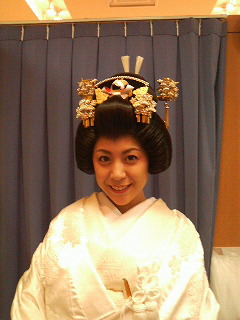 花嫁って大変ですなぁ…(汗) 頭が重くて、気を抜くとカクッっといってしまいます(^^; 二時間程この姿で居たけど、超〜肩と首が凝って痛かったよ〜。