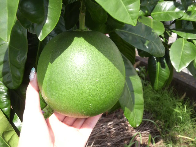 今日の画像はバンペイユ☆以前ブログに載せた時は柚子位の大きさだったけど、今はグレープフルーツよりも大きくなりました(^O^)ただ…木が小さいから、これ一個しかなってないんだ(^^;