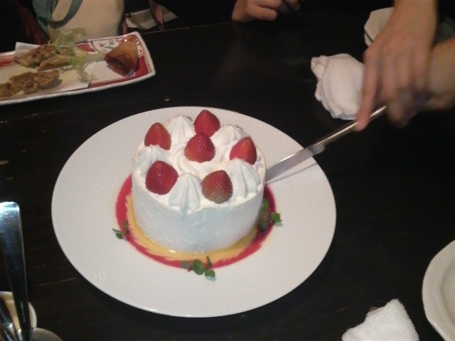食べて飲んだ後は、サプライズケーキとプレゼントでお祝い♪(^O^) せっかくだから、女2人でケーキカットの予行練習して頂きました(笑) 12月の結婚式が今から楽しみだよ(o^-^o)♪