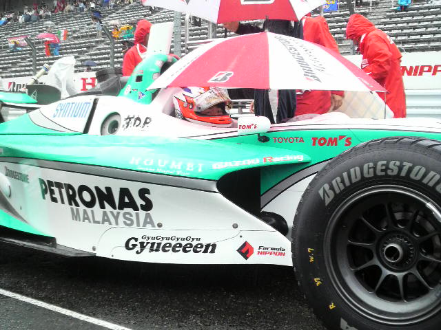 土曜日の天気予報では日曜は曇りって言ってたのに、いざ着いてみると雨・・・(-_-;) ん〜さすが富士スピードウェイ・・・。そして今年のフォーミュラーニッポン、今のところ全部雨じゃん(-_-;)