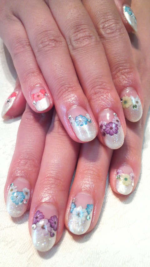 Hello〜(^O^)♪昨日はネイルサロンに行ってきたよ!! 今回は押し花風シールで、カラフルにして貰いました〜(o^-')b夏っぽく仕上がったよん♪
