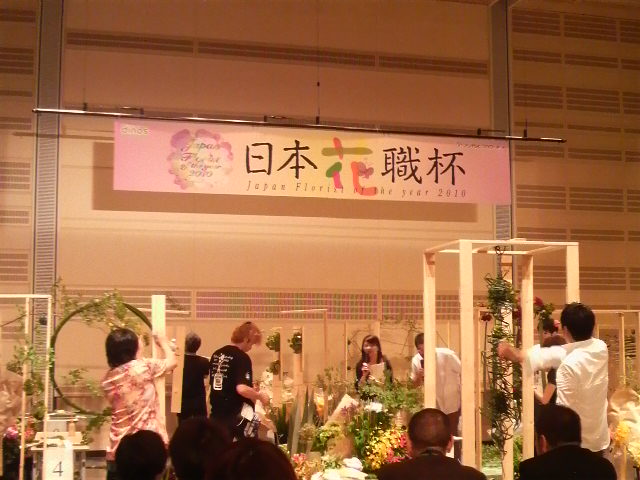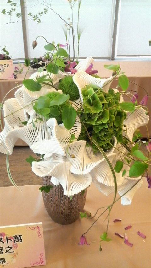 私はフラワーアレンジメントに詳しく無いから、ブライダルフラワーの仕事をしている友人に色々聞きながら見てたんだけど、それぞれ個性があって面白かったよo(^∇^)o ちなみに優勝者は、写メ二枚目の作品を造った山梨県の方でした!ホントに素敵な作品で、職人って凄いな〜って思ったよ!!