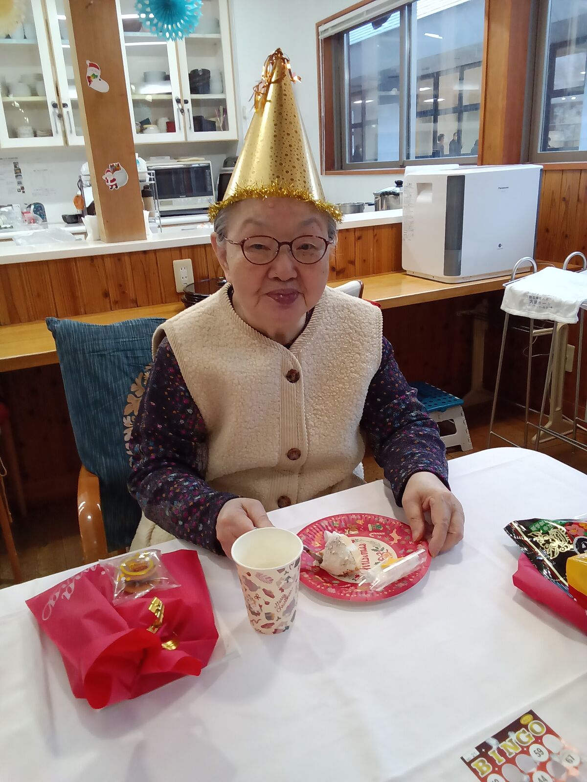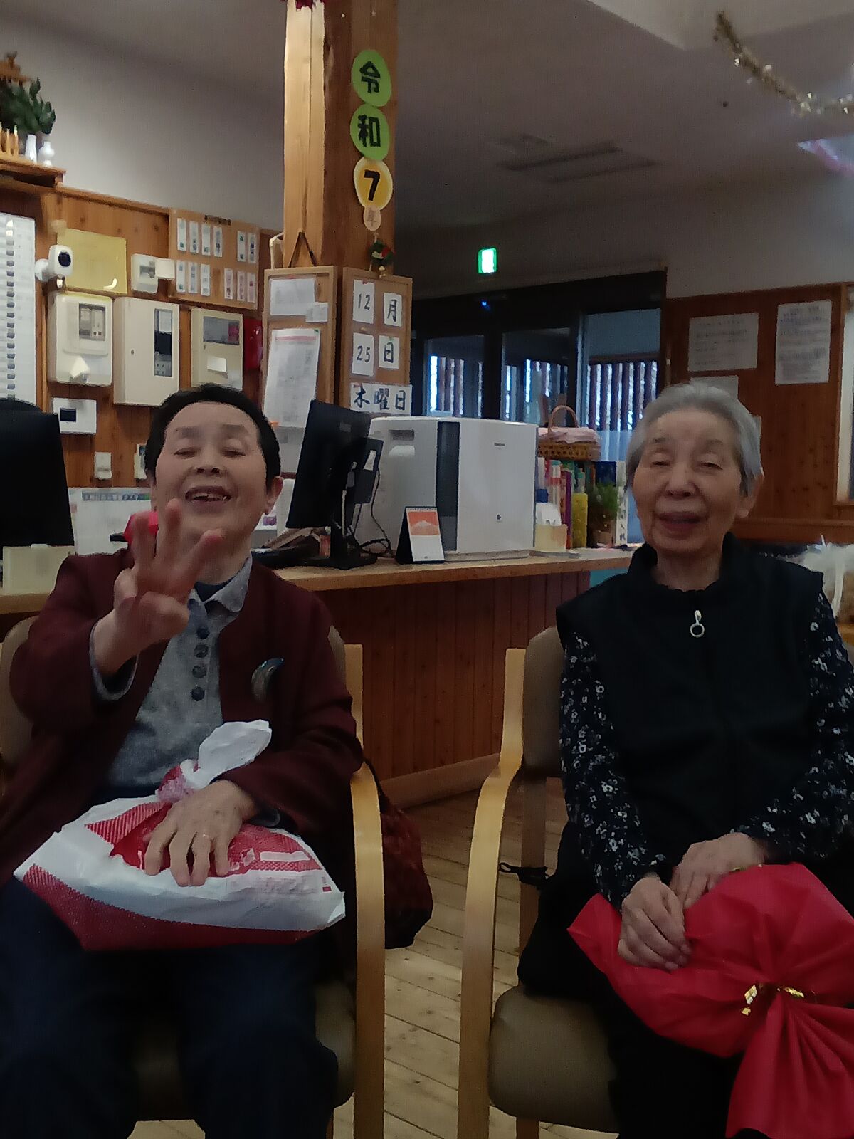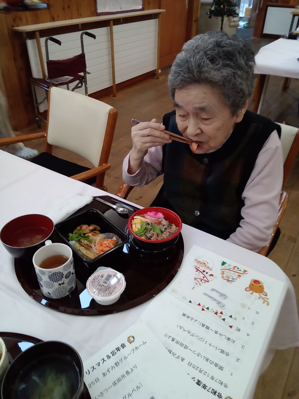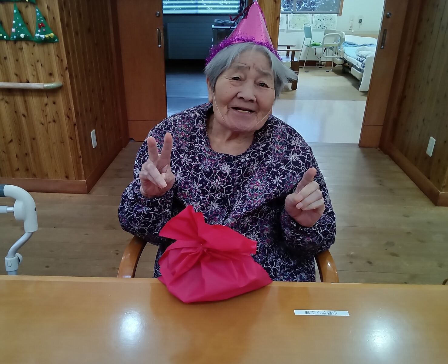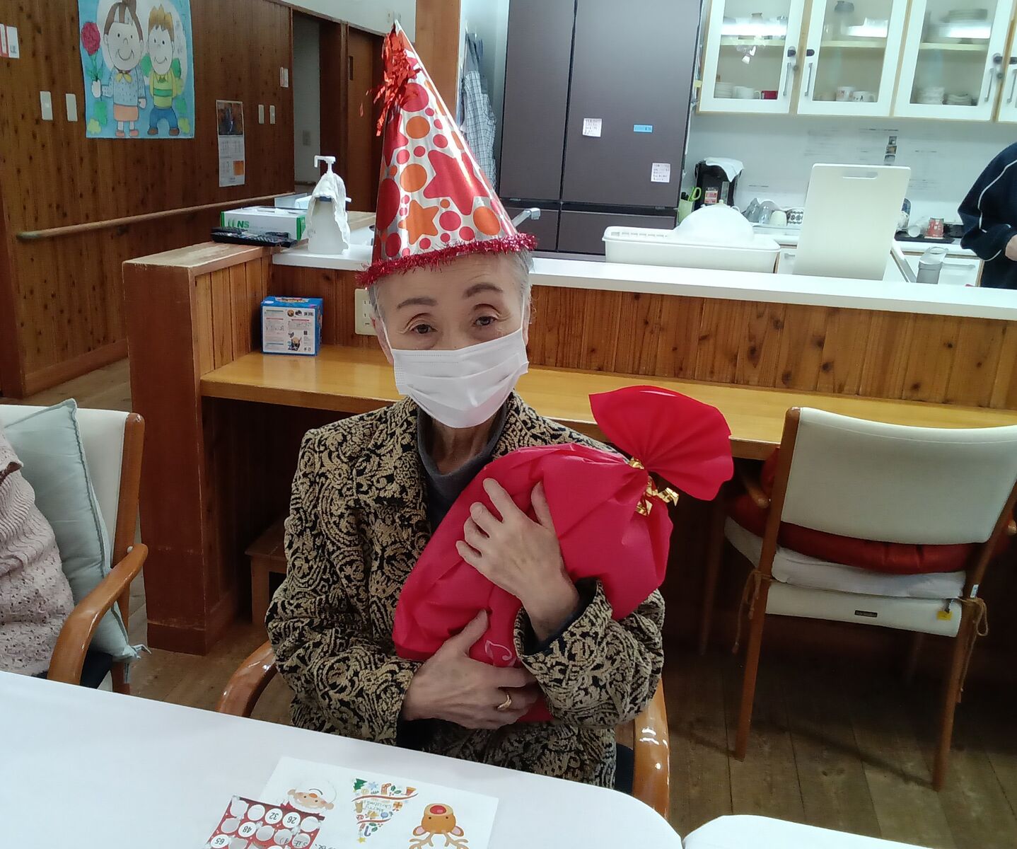 2025 12月 31 10:01:00 Xmas🎄&忘年会🎊 ユニット2 楽しみにしていた、Xmas&忘年会です!職員のかくし芸、上手く出来るかな?東京から来てくれました!「キッスは目にして」や「朝まで踊ろう」の曲で盛り上がりました!ボリュームのある、お弁当🍱が大好評でした! ちらし寿司は、大好きです! プレゼントが届きました! なんてったって、ケーキ🍰よねえ〜🍮