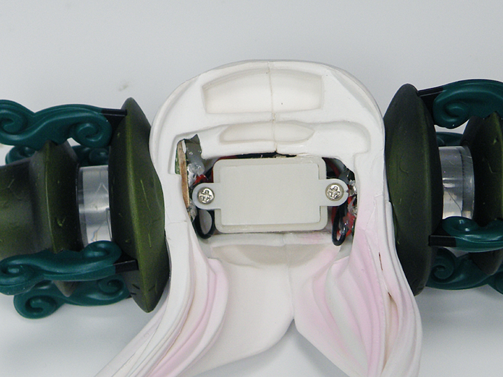 頭部には電飾が仕込まれていて、頭飾りが発光します。