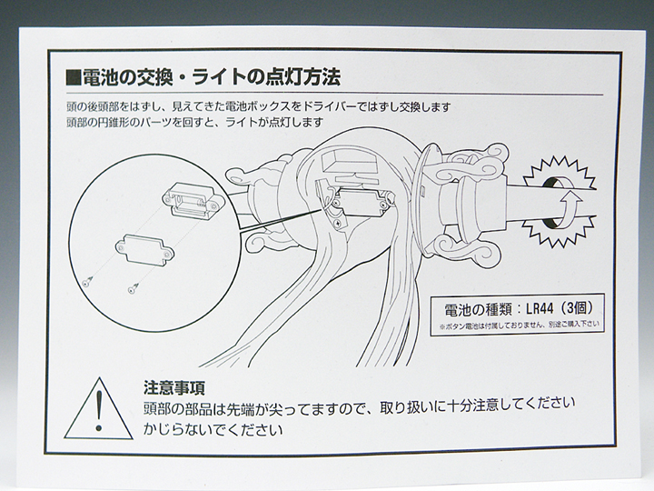 また、発光ギミック内臓のため、電池を別途用意する必要があるのですが、使用電池はパッケージに記載無し。
