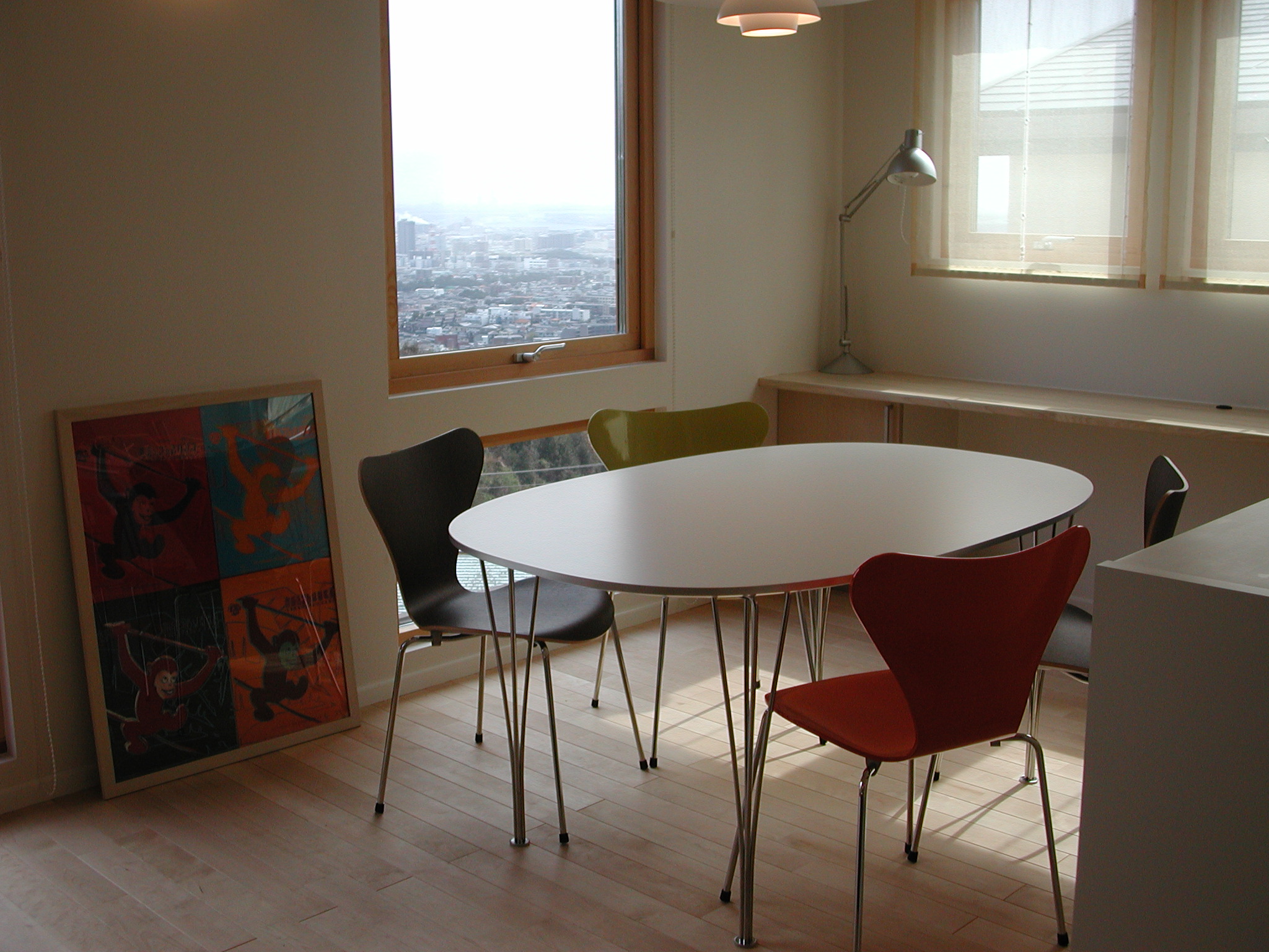 セブンチェアーは4脚並べていますが、子供は今使っているSTOKKEをそのまま使う予定ですので、普段は背面に見えるカウンターに置く予定です。