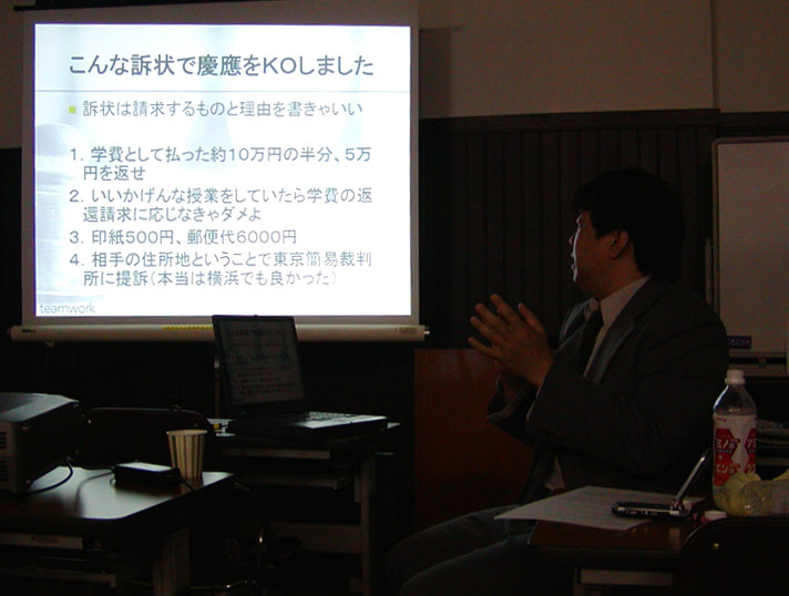 今回は私こと松本肇が講師でした。私が1999年に起こした慶應義塾大学通信教育部レポート遅延訴訟の顛末と、民事訴訟法の基本的な解説、そしてもし日本に民事陪審のような裁判員制度ができたら、どのような効果があるのかという予測をお話しさせていただきました。
