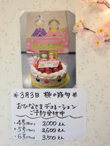 お菓子の家・遊菓では、桃の節句デコレーションケーキ、予約受付中です。