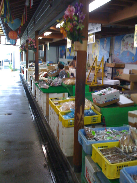 朝からの雨で、野菜のおばちゃん達は早々に退散。海産物のおばちゃん達も開店休業状態です。
