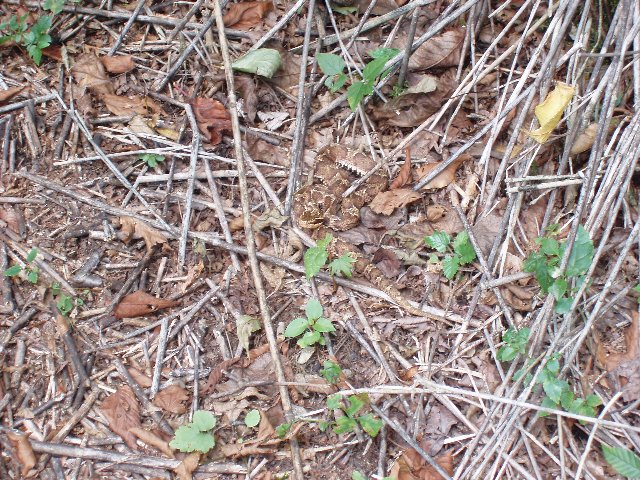 歩くと山ブドウやアケビなどクマの餌となりそうなものもよく見かけられる。上ばかり向いて歩いていると足もとに危険なものが潜んでいた。目が悪いのかなかなか分からなかったが、結構な大きさのマムシではないか。山に登り始めて5年たつが、初めてマムシを見た。これが動かない。この道を行きたいのだが、どいてくれない。仕方なく、恐る恐る横を通らせてもらった。