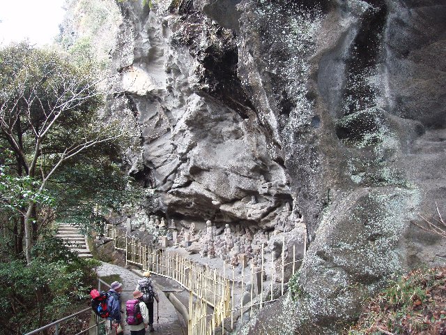 春の陽気も感じられる房総・鋸山へ。昔はこの山から石を切り出していた。その石を切り出して運んだ道がそのまま登山道になっている。山は石を切り出した跡で軍艦のようにそびえ立っている。観光客はロープウェイで上がる。さすがに登山靴を履き、リュックを背負ったスタイルでは乗るわけにはいかない。が、たいした登りではない。体が暖まったころに頂上で、その前に入場料を払う。大人一人600円なり。それにしてはトイレもないし設備が悪いな。