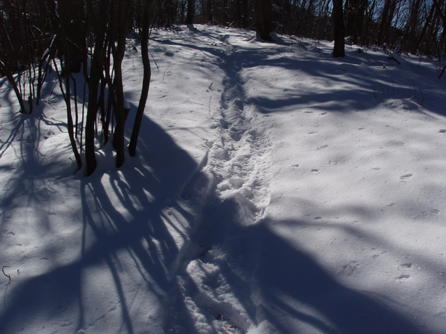 ここからは誰も歩いた跡もない道だと喜んだのもつかの間、フリースを脱ぎ、水を飲んでいる間にバスで一緒だった夫婦に先を越されてしまった。でもまあ、二人しか先行していないと思い、軽い雪をけ飛ばしながら歩いていたのだが、これがボディブローとなって後から利いてきた。登山口から浅川峠までの標準時間は50分。浅川峠まではほぼピッタリの時間で歩くことができた。先行する夫婦連れは浅川峠から扇山へ向かった。ここから権現山までは誰の足跡もない。少しの雪とはいえラッセルしながら歩くのである。段々疲れる。
