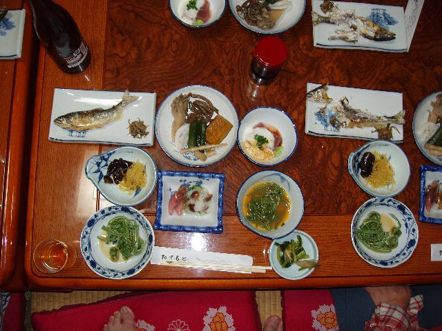 写真は夜食、ヤマメの塩焼き、マイタケ・ゼンマイ・タケノコ・ウド・カボチャの炊き合わせ、マグロのやまかけ、アケビの蔓、コゴミなどの山菜がいっぱい。宿代が安かったから期待していなかったがこれだけあれば満足。というか、その前に飲み食いしすぎてほとんど食べられなかった。情けない。