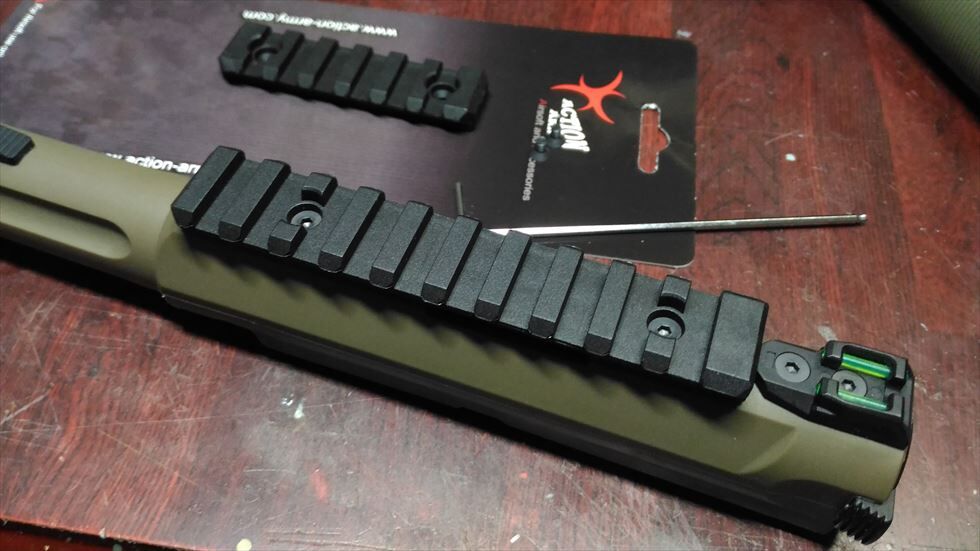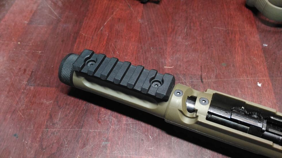 まずはトップレールから付けていきます。アッパー上面の穴にビスをねじ込んでレールを固定しますが、この穴にはネジ切りがないので付属のビスを慎重に直接ねじ込んでいきます。