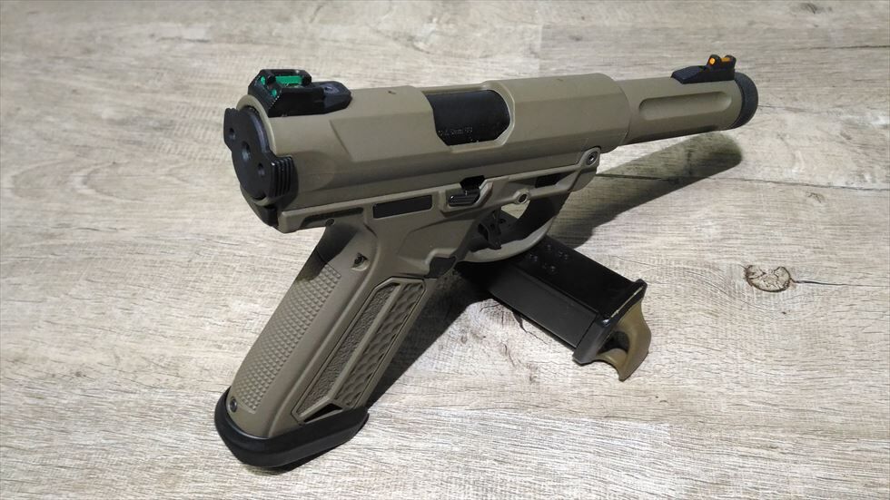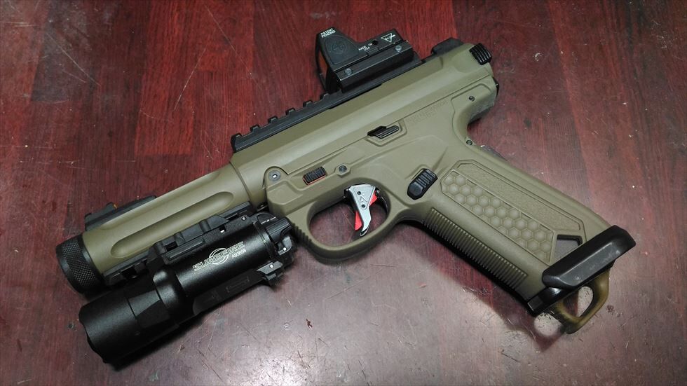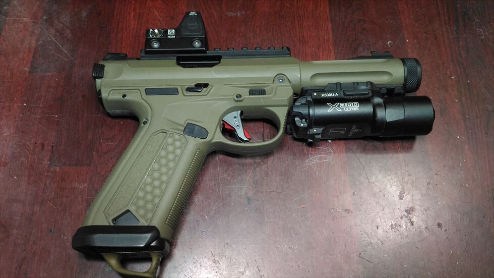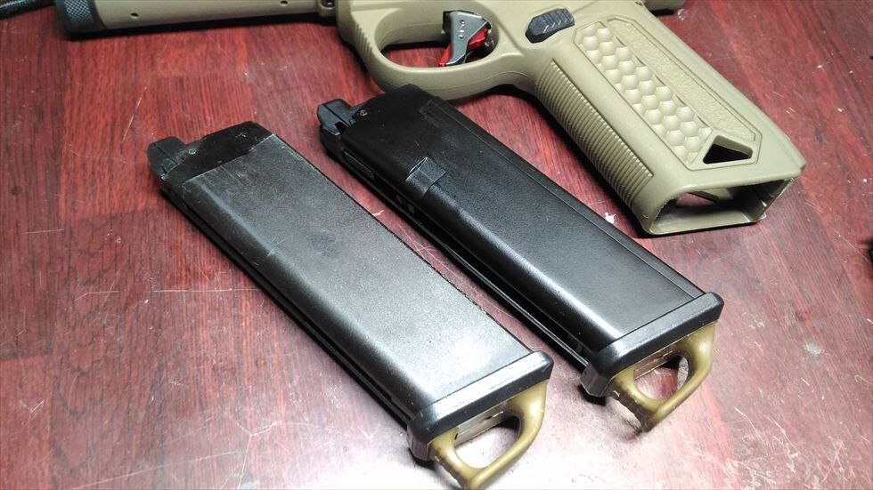 いやぁモダンでとてもかっちょいいですね。反射しちゃってますが赤いトリガーセーフティが良いアクセントになっています。形状変更したマグウェルとそこから飛び出すマグバンパーも悪くない雰囲気です。コンバットオートというよりは趣味のシューティング用という趣ですね。何年も前に買っておいたマルイのガスで空撃ちしたところセミフルどちらも快調に作動しておりました。
