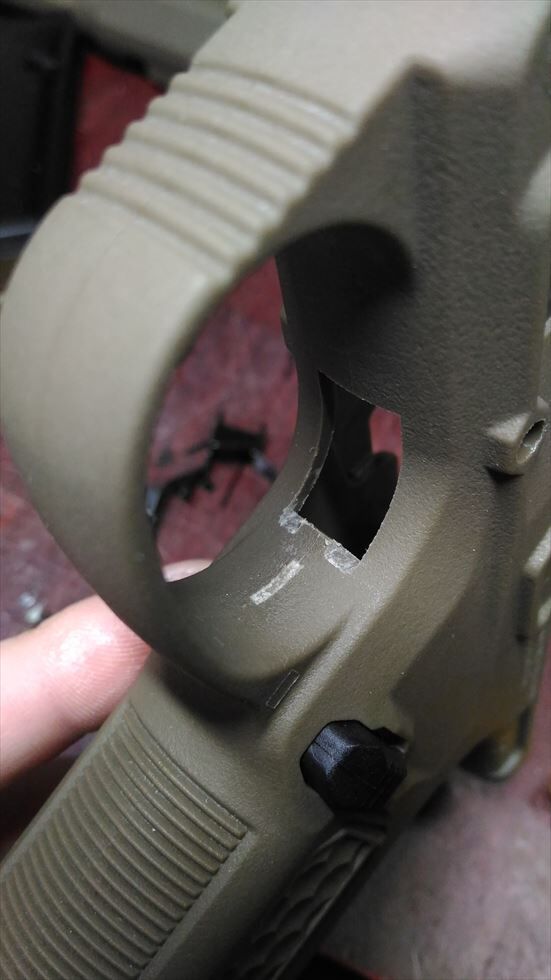 まずトリガーを付けたのですがポン付けでは動かなかったので手あたり次第干渉してるっぽいところを削り倒してみましたが、銃の取説で言うところの「ハンマーセット」の57番のパーツが効いてハンマーダウンしなかっただけな気もするのでここまで削る必要はなかったかもしれません...