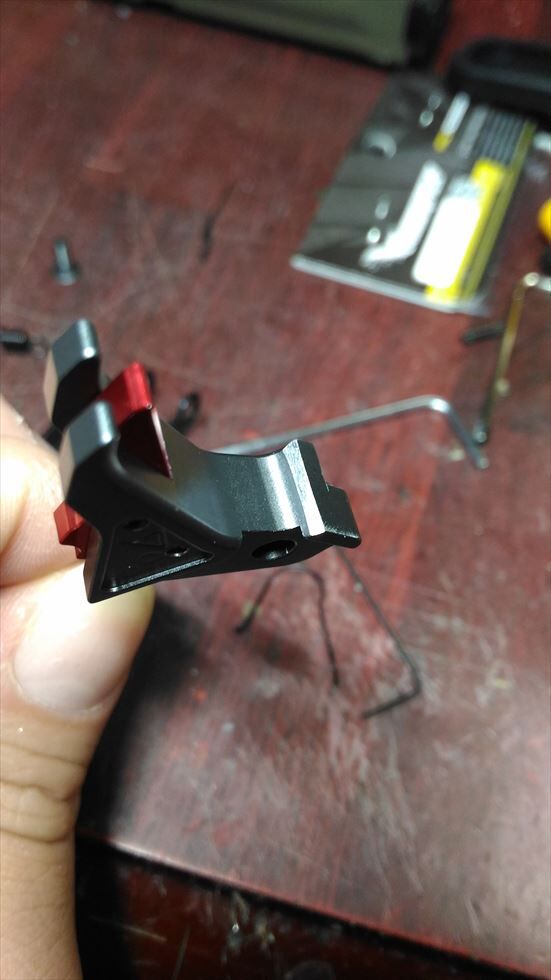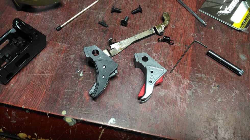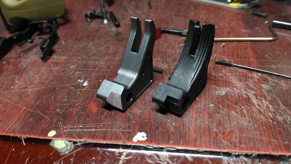 ほんでまぁ内部は某マルイのグロックを踏襲してるとかなんとからしいので一緒に頼んでおいたグロック用のパーツを移植してみようと思いました。付けるのは写真の通りグロック用のAGENCY ARMSタイプトリガーとマグバンパーです。