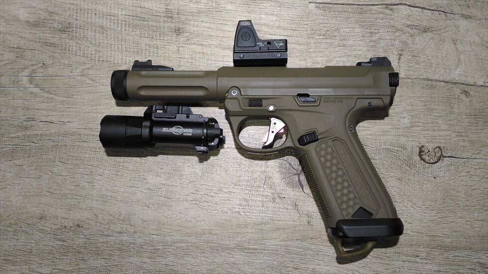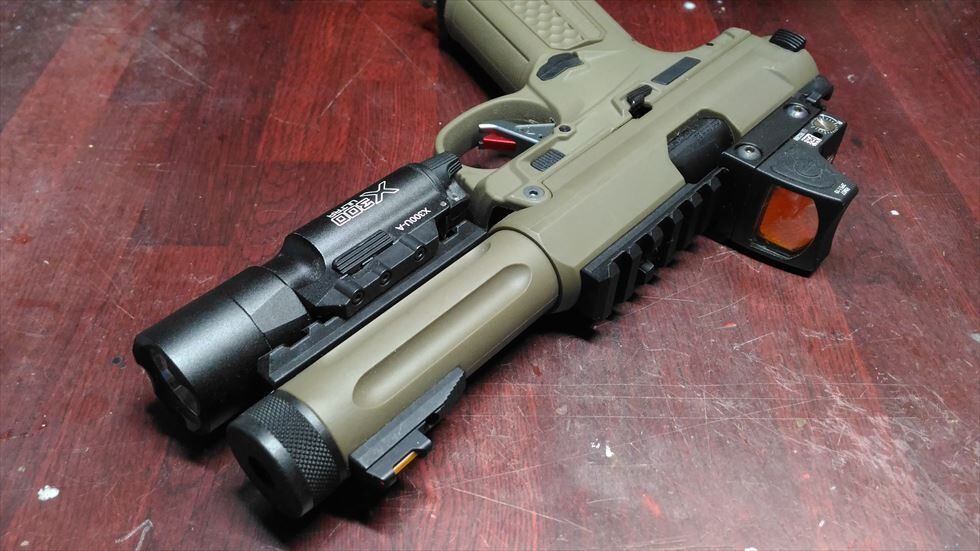 で、今回は買い忘れちゃったんですが純正オプションのレールセットを装着すると写真のようにライトとかドットサイトも搭載できるようになるんですよね...集光サイトは非常に見やすいためわざわざ光学サイトに替える必要は感じませんが、ハンドガンのもりもりスタイルはロマンですのでレールセット買っちゃおうかなと考えとる次第です。他にはコンペンセイターとかグロック用サムレストとかも付けてみたいっすかね~...
