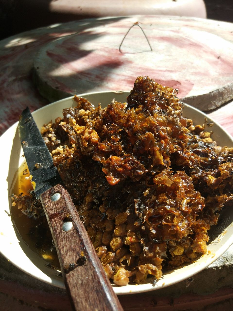 女王蜂の卵があれば、それを他のプロポリス、蜂蜜の入った蜜ポット、卵ともに新しい巣箱に入れてあげればいいのですが、この日はなかなか女王蜂の卵が見つかりません。