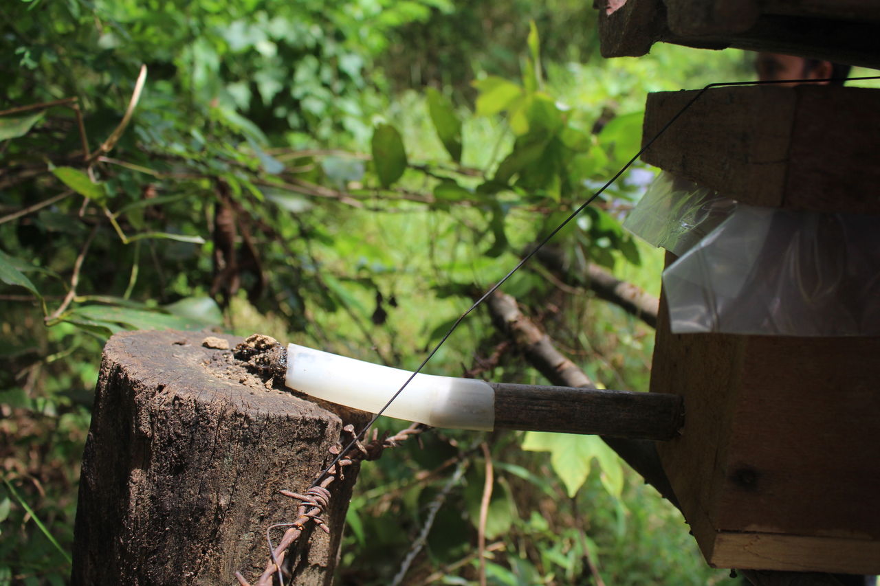 事務所の裏にある畑で見つけた自然のハリナシミツバチの巣から、巣箱にコロニーを移す方法を見てもらったあとは、分蜂する方法をデモンストレーション。