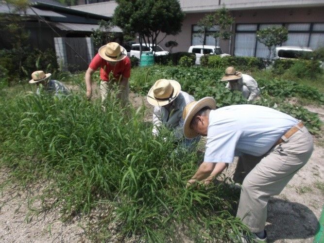 利用者さまと一緒に草抜きを、汗を“かきかき